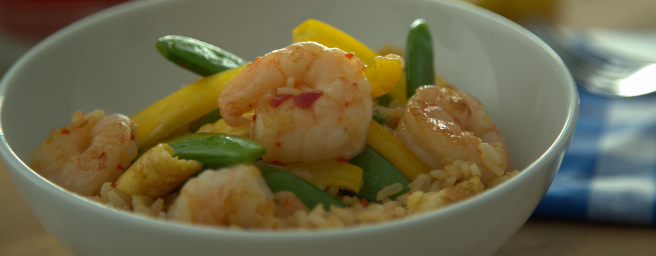 - Now add cooked rice, egg and prawn mixture, and cook until thoroughly heated.